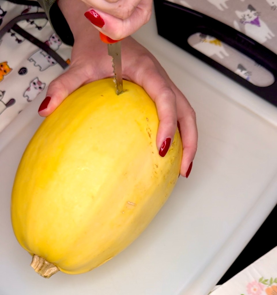 Now let’s talk about how to cut a spaghetti squash. I have literally made spaghetti squash so many times and it wasn’t until fairly recently that I put my thinking cap on and realized that it’s a gourd with seeds, similar to a pumpkin. Then I whipped out my halloween box and my pumpkin carving kit and attempted what seemed to be too good to be true. Y’all! It was true! Using those tiny little pumpkin carving knives to cut a spaghetti squash is by far the easiest and BEST way to cut a spaghetti squash!