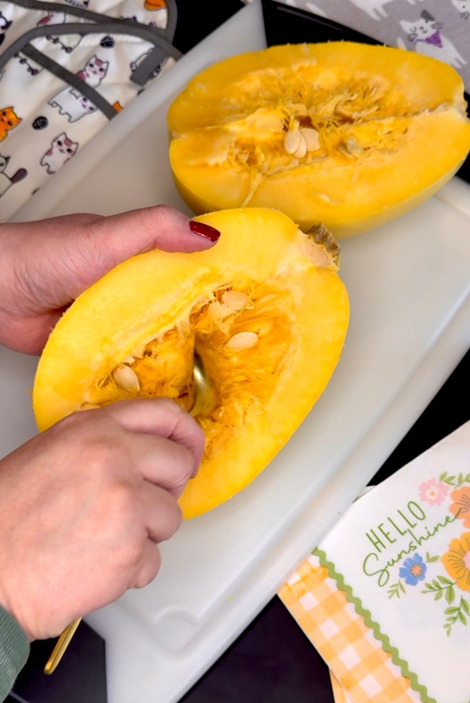 Then you just scoop out the insides of the spaghetti squash like you would a pumpkin. Congratulations! You have successfully cut and cleaned a spaghetti squash the easiest way possible! The Gold cutlery is from Amazon.