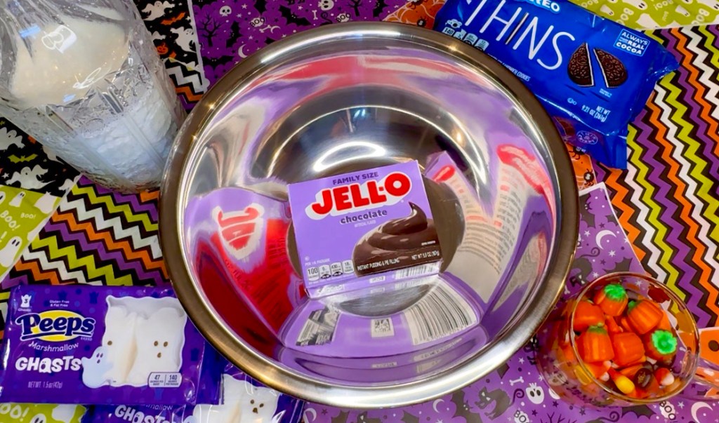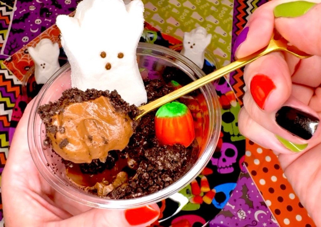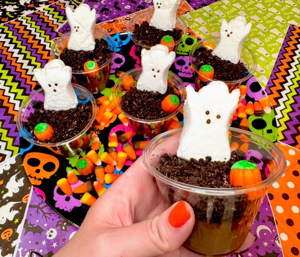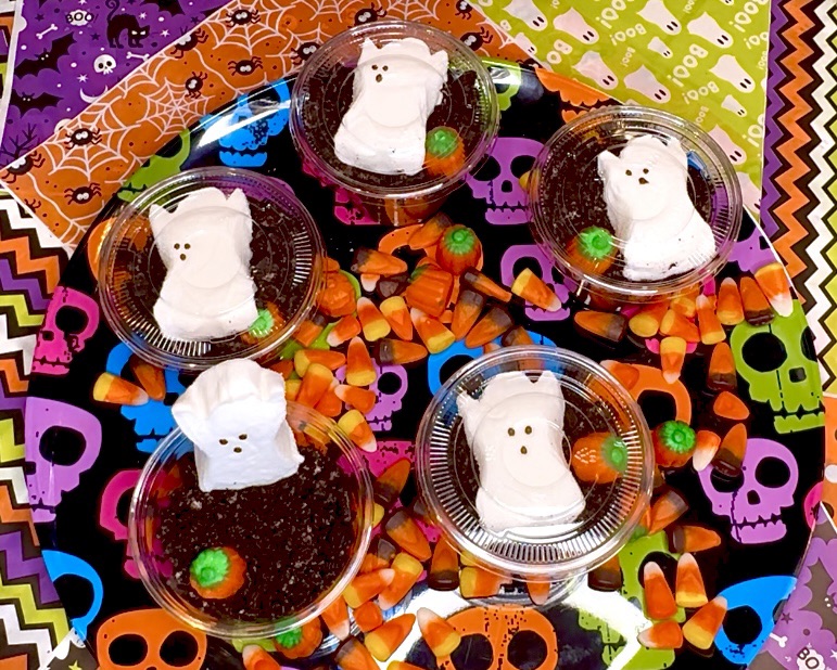 I popped these Ghost peeps from Amazon on top and that’s all folks! Cute and easy Halloween dirt pudding cups made spooky with ghosts and pumpkins!