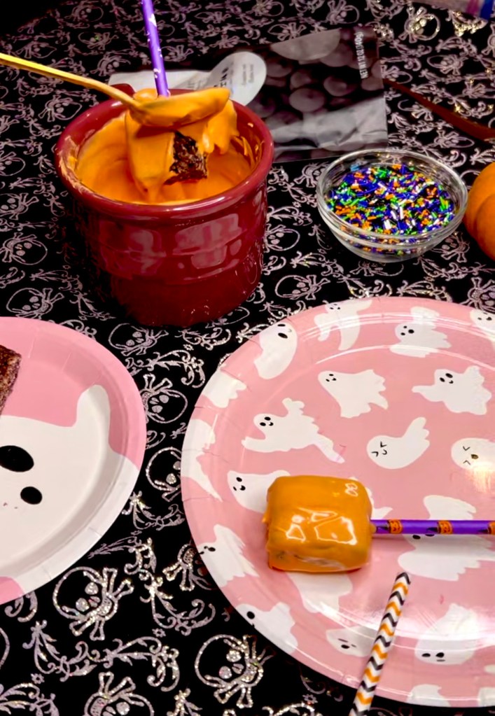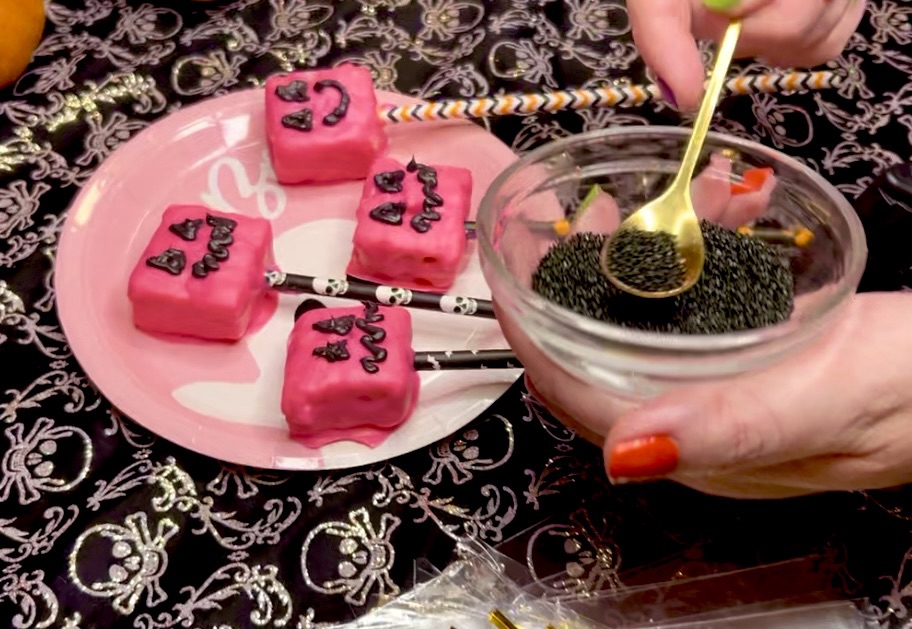 I put some black sugar sprinkles on some of the Minecraft pumpkin faces using my fave Gold espresso spoons from Amazon but they’re just as cool without them.