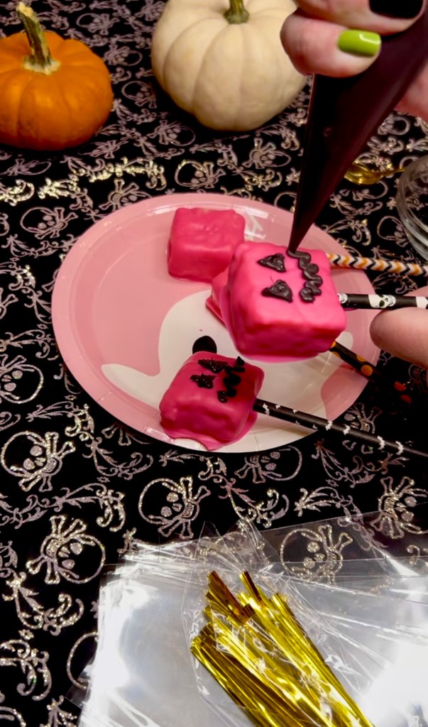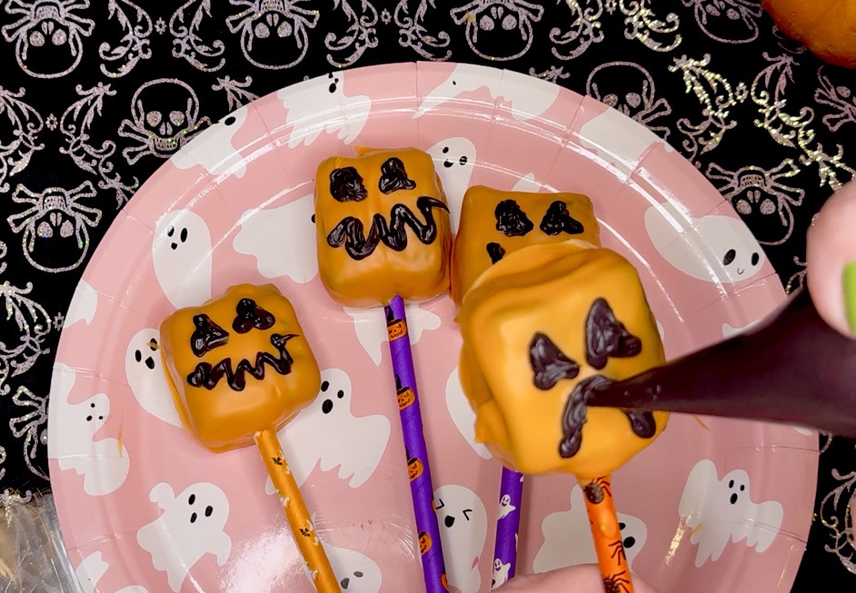 And then you just make your little pumpkin faces. I had a hard time because this melting chocolate, y’all, it was giving me such a hard time, but I enjoyed making silly Minecraft pumpkin faces anyways.