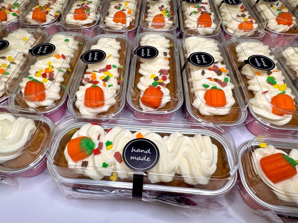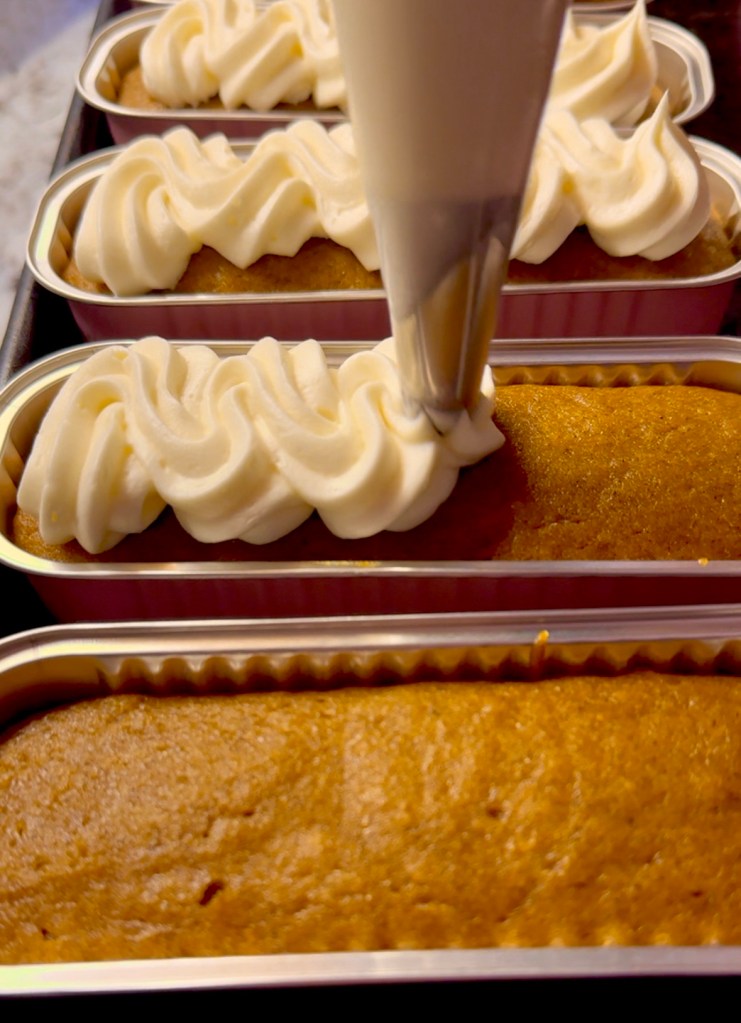 I make the pumpkin spice mini cakes the night before and store them in the fridge after they cool. Fun fact, a 2 gallon ziploc bag holds 10 mini loaf pans without the lid and 8 with the lids on. I used this Piping set from Amazon for the tips and the piping bags.