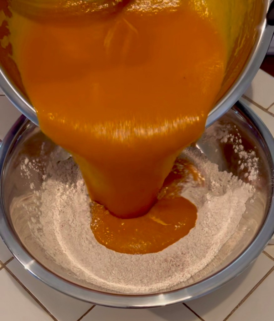I also folded the wet and dry together, not using a whisk, so that I don’t build up gluten. Plus it’s a thick batter. I highly recommend using a Scale from Amazon to measure the flour and sugars.
