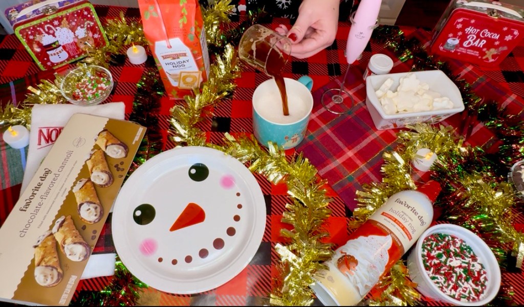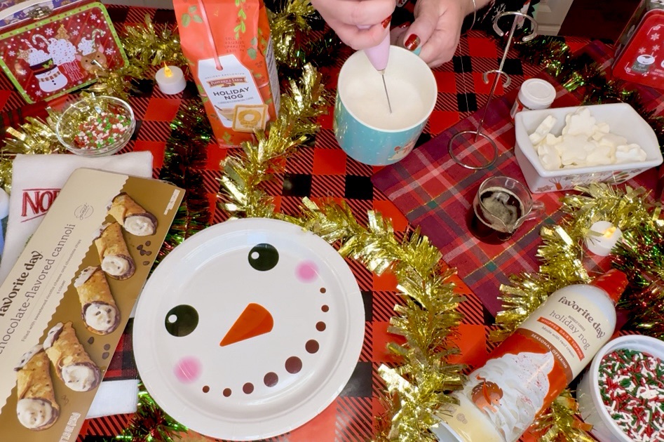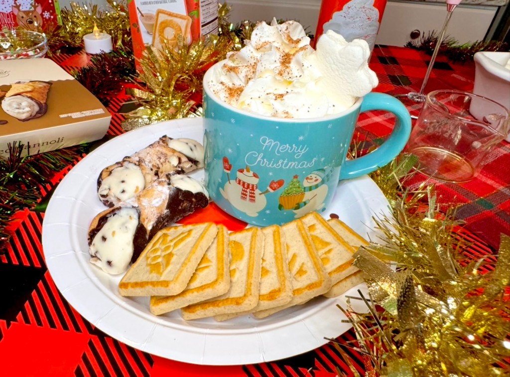 I topped the holiday egg nog coffee latte with the holiday nog whipped cream from Target and added some snacks! These cannoli in the frozen section of Target are absolutely incredible. I highly recommend! The snowman plate is also from Amazon. It comes in a set of Christmas themed paper plates and I’ve been using them all holiday season!