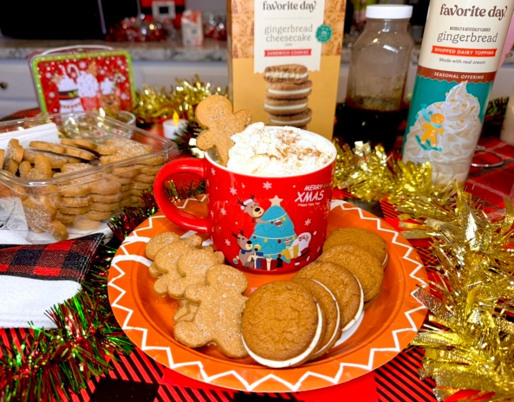 The gingerbread syrup will thicken as it cools. I used it hot because I’m making hot coffee, but let it cool before putting in the fridge to store. I love these square glass jugs for things like this. The gingerbread plate and all the other paper plates I used are part of that same Christmas set from Amazon.