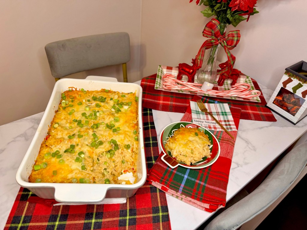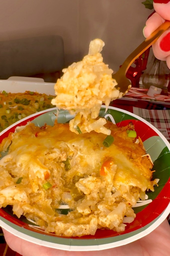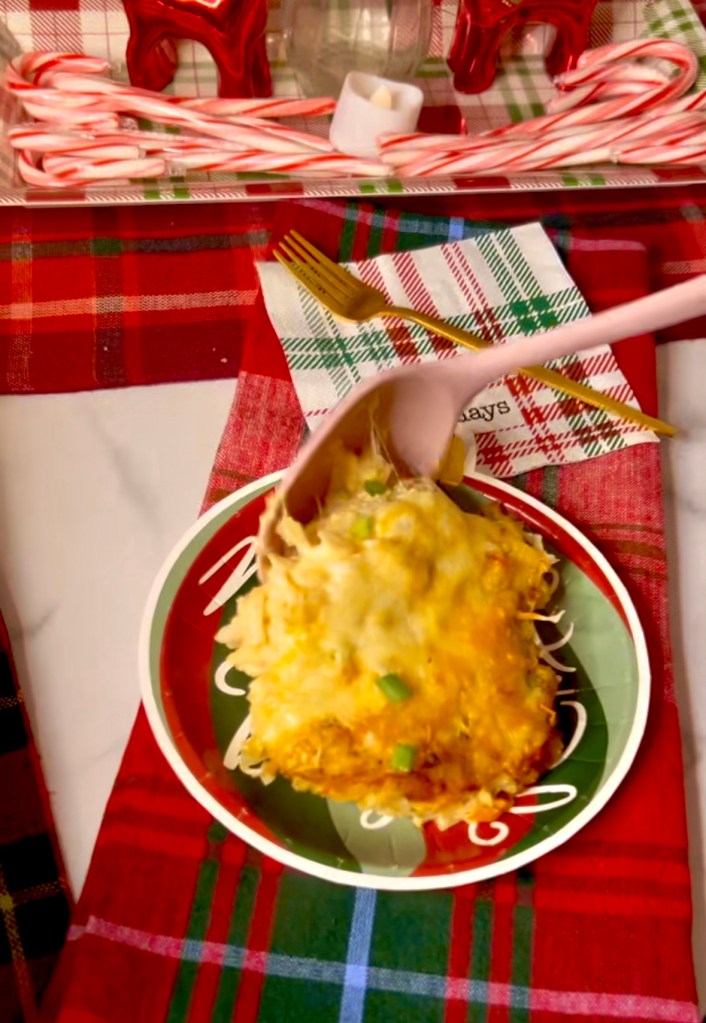 But the Christmas paper plates from Amazon make clean up a breeze! Also, I highly recommend this Garlic Fresno hot sauce from hot ones. It’s not too spicy, adds a ton of flavor on so many dishes but pairs super well with this copycat Cracker Barrel hashbrown casserole. I put it on the chicken to add flavor without a ton of sodium.