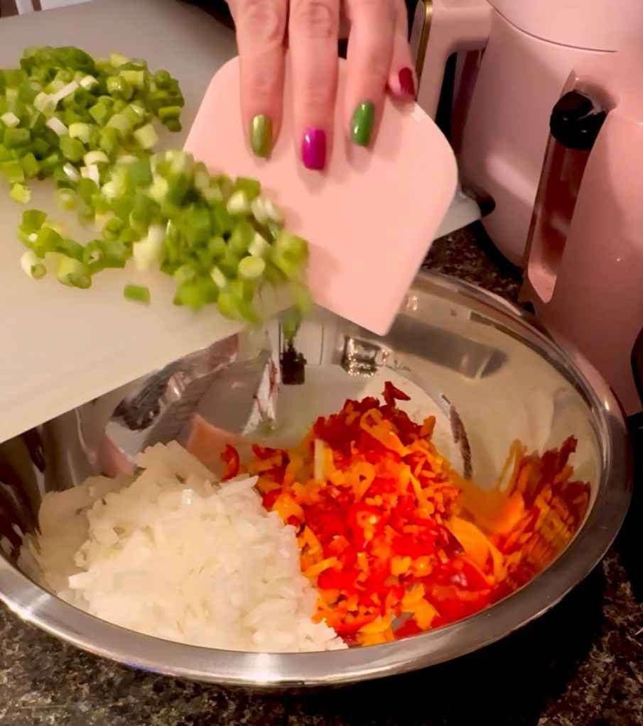 - Mix together all of the ingredients, except save half of the cheeses for the top and half of the green onion for garnish