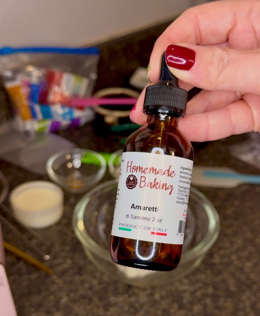 While the Christmas cinnamon rolls are in the air fryer, I’m going to mix up an amaretti icing using the icing that the cinnamon rolls come with. I mixed together about 2 tbsp softened cream cheese, 3-4 tbsp powdered sugar and a few drops of this beautifully flavored Amaretti Essence. You don’t need much and it elevates these Christmas tree cinnamon rolls to the next level!