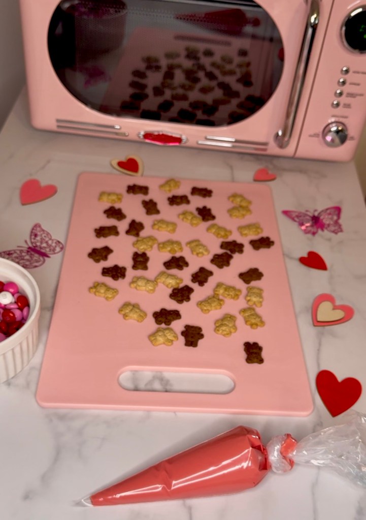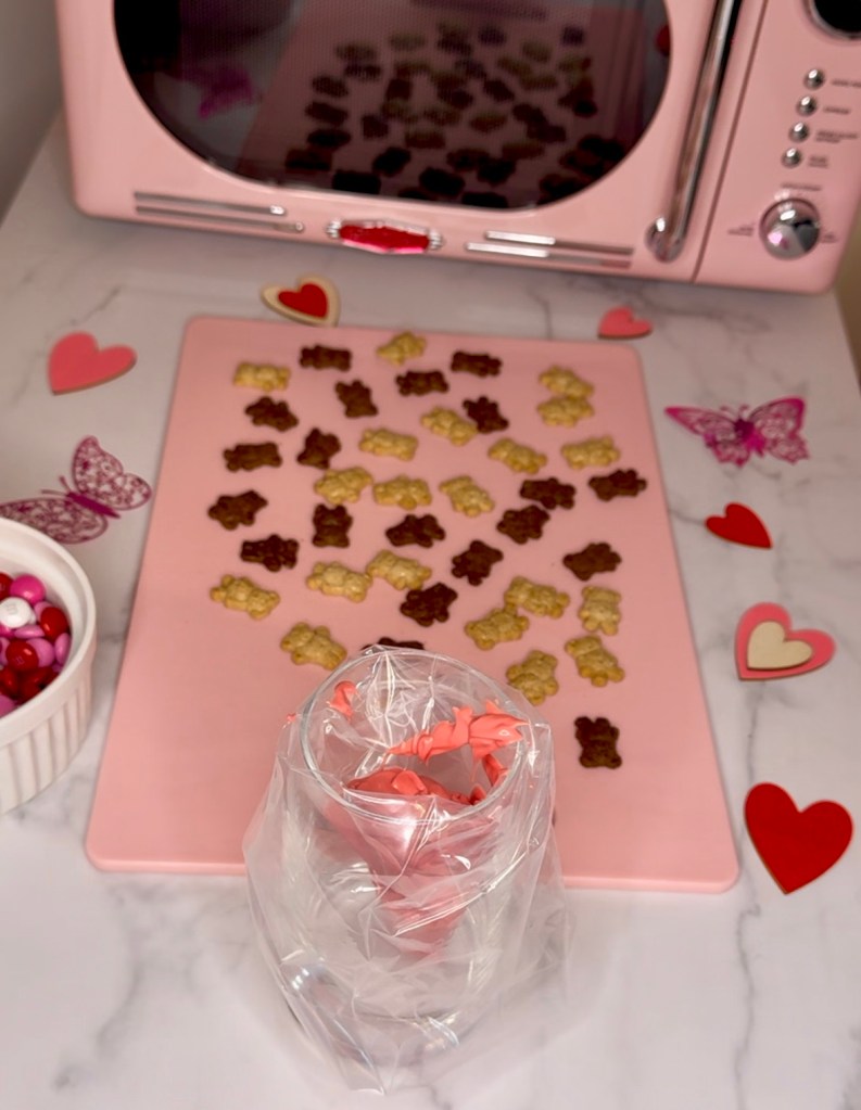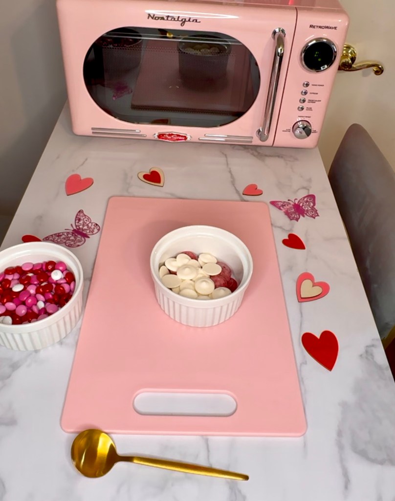 These easy Valentine’s Day sweet snacks are fun to do with the kids for school Valentine’s Day parties or as homemade Valentine’s Day gifts. Really I just wanted an excuse to use my new Pink retro microwave from Amazon! The pink cutting board is also from Amazon, as will the other products linked in this blog post.