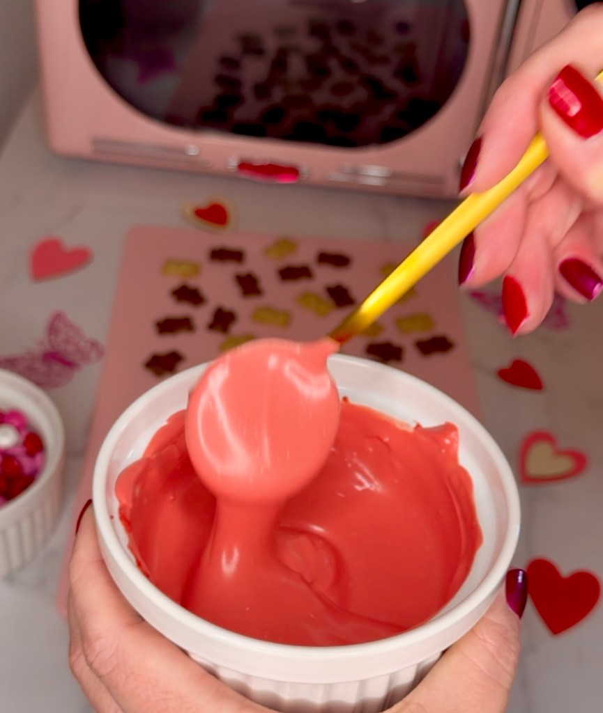 I didn’t use too many this time because I did want it a little thicker since we aren’t dipping anything into the melting wafers, were using them as a ‘glue’ for the Valentine’s Day M&Ms.
