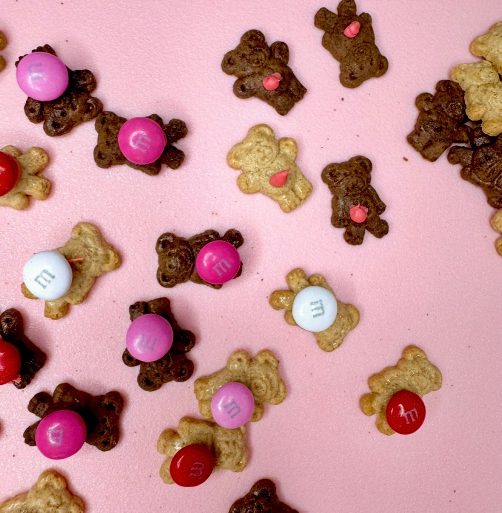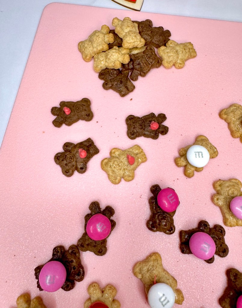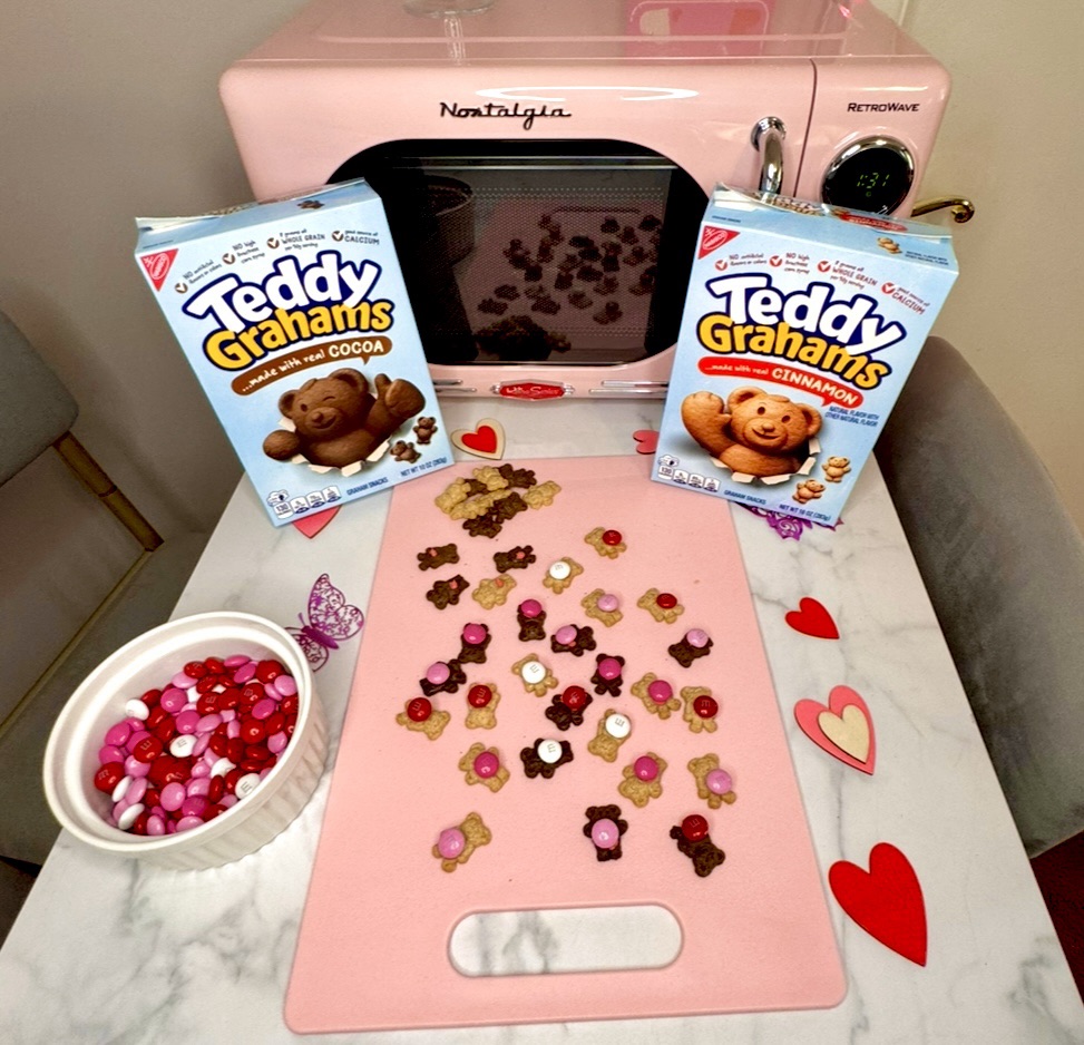 I was surprised how much adding the Valentine’s Day pink M&Ms mix would elevate the teddy grahams for an easy sweet snack.