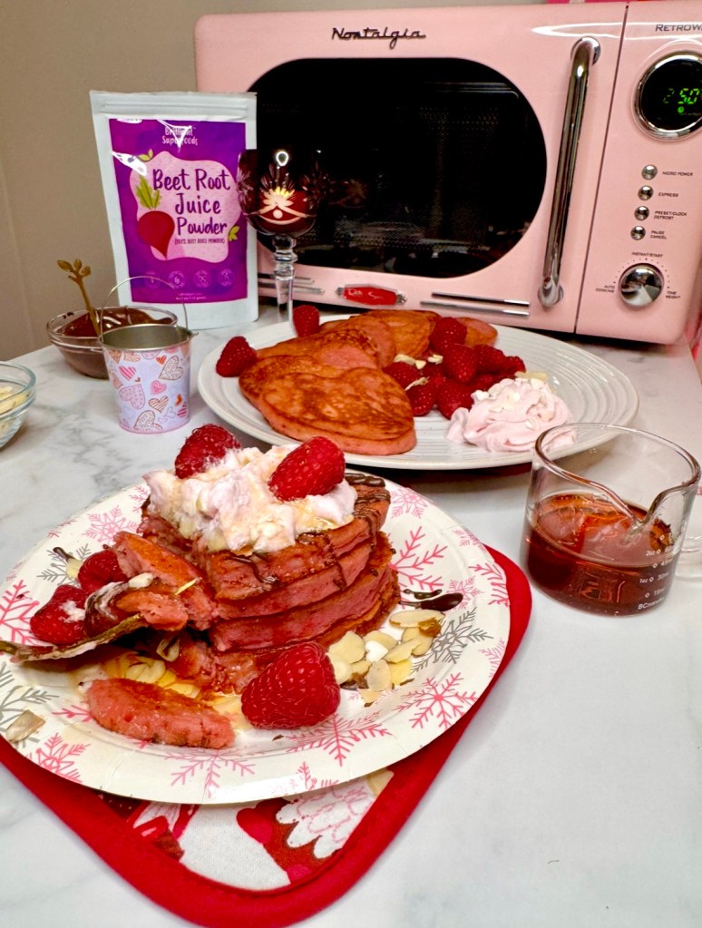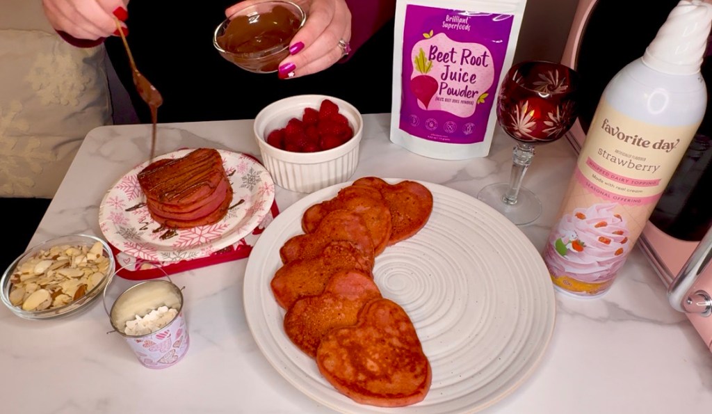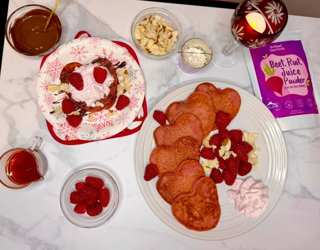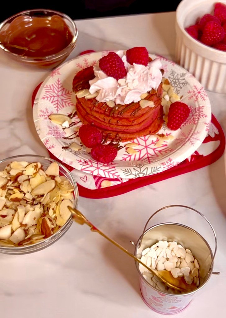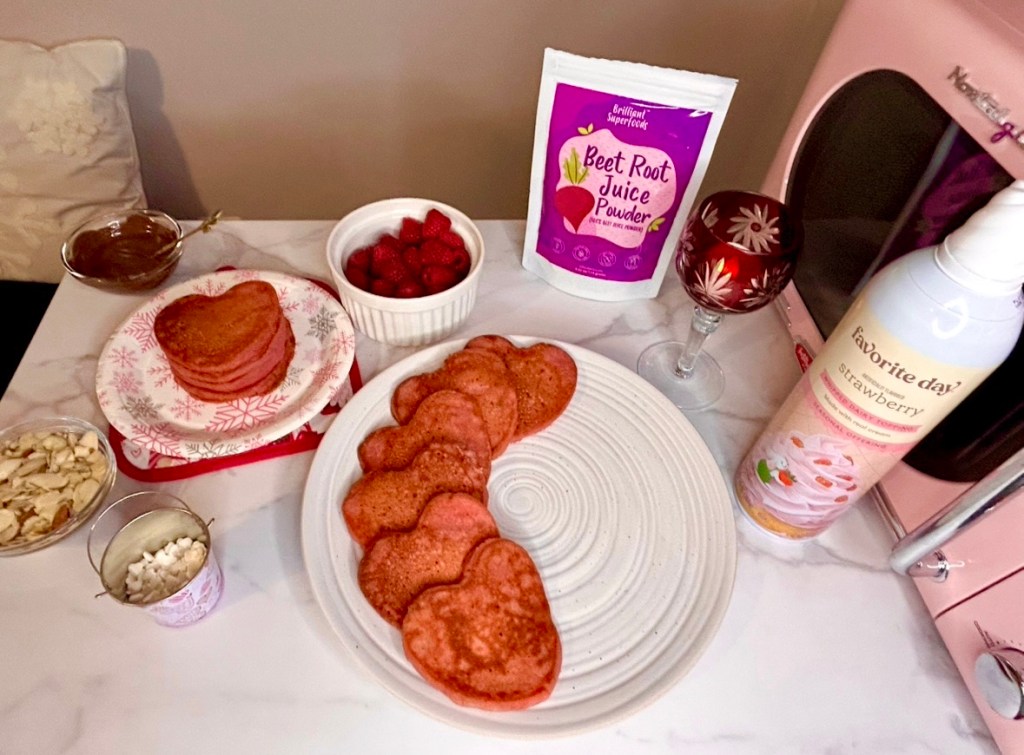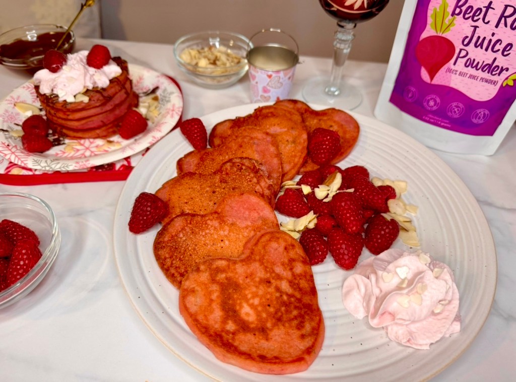 You can use whatever you want to decorate your heart shaped protein pancakes using beet root powder. Some of the toppings we chose were not vegan, so if you’re making these plant baked egg free dairy free pancakes, be aware that your toppings will be different than mine.