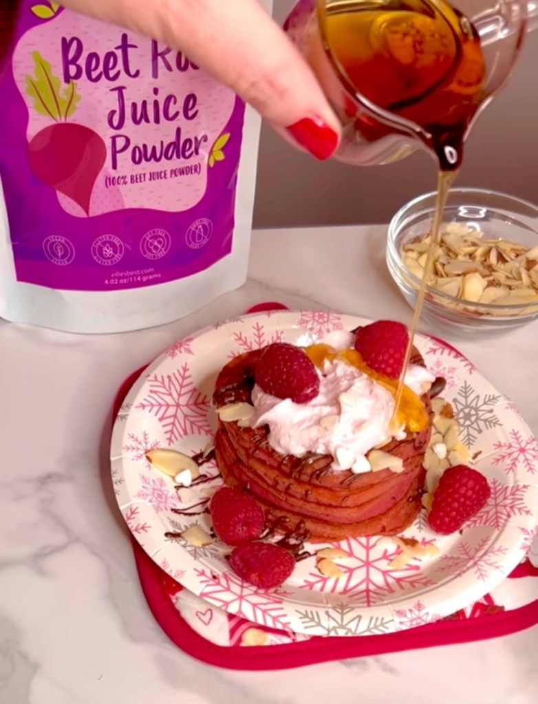 I also used Ellie’s Best beet root powder for the natural color of these protein pancakes. It adds extra antioxidants too, which is nice.