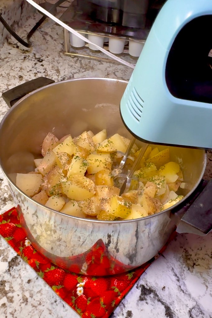 - Add all ingredients to potatoes after straining and mix with a hand mixer for just a few seconds and add extra milk drizzle to desired consistency