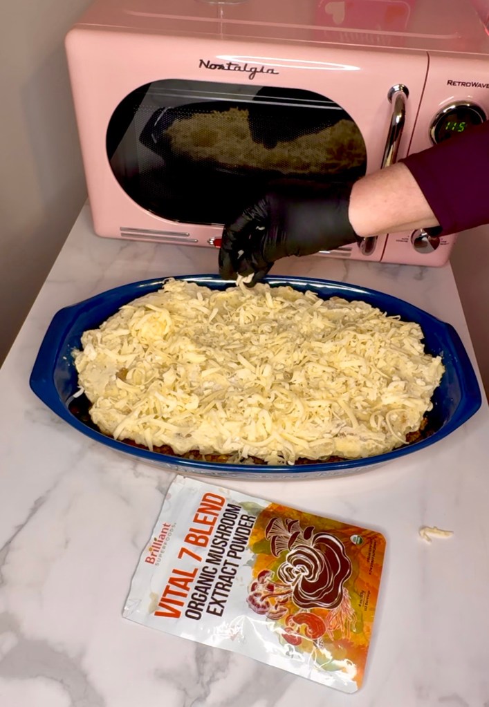 Keeping with the healthy theme of this cottage pie, I used ground turkey and made sure I added this Mushroom powder by Ellie’s Best for more umami flavor and extra health benefits.