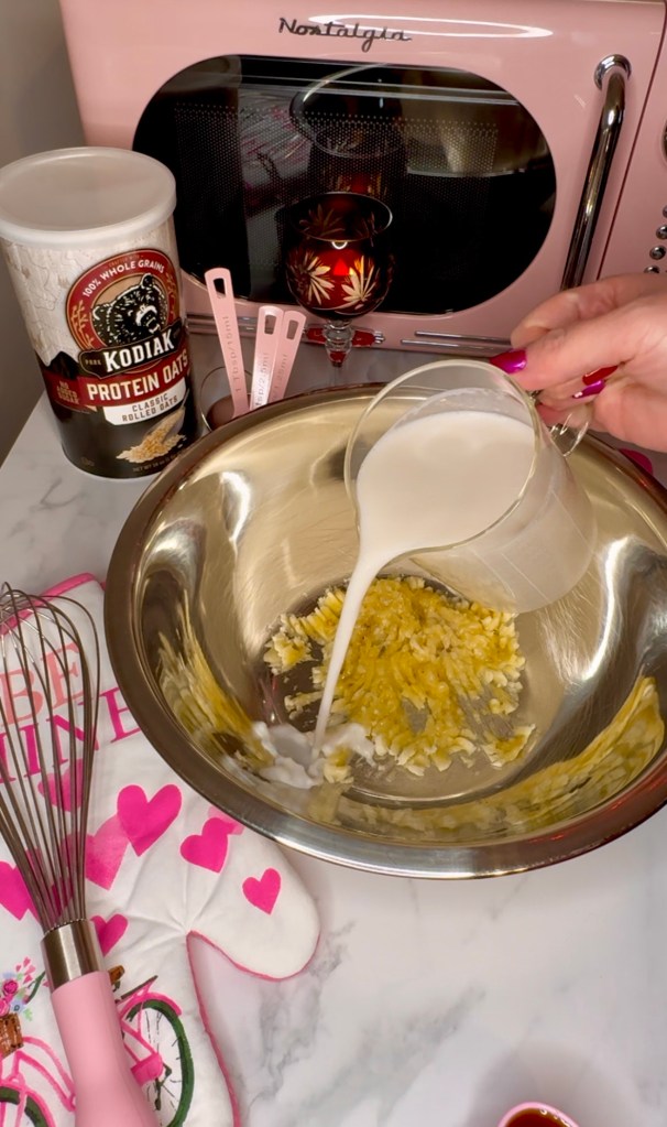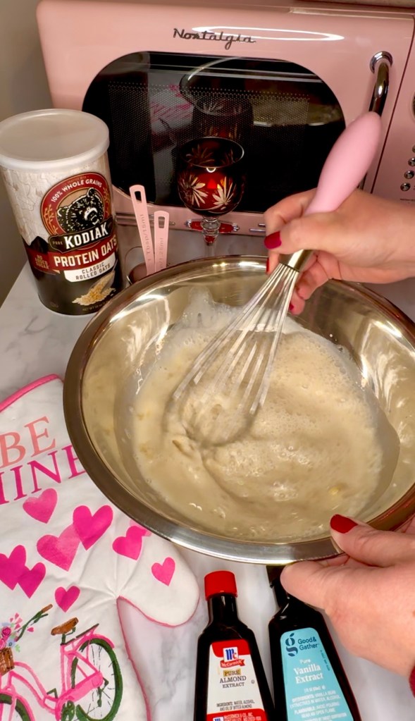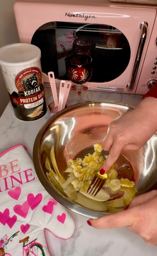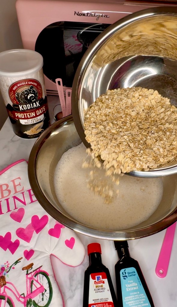 I love using these metal bowls to pre measure my ingredients before starting the baking process so I am mostly in one place and don’t forget something. Plus they’re super lightweight, which I love. I also used Kodiak oats because extra protein!