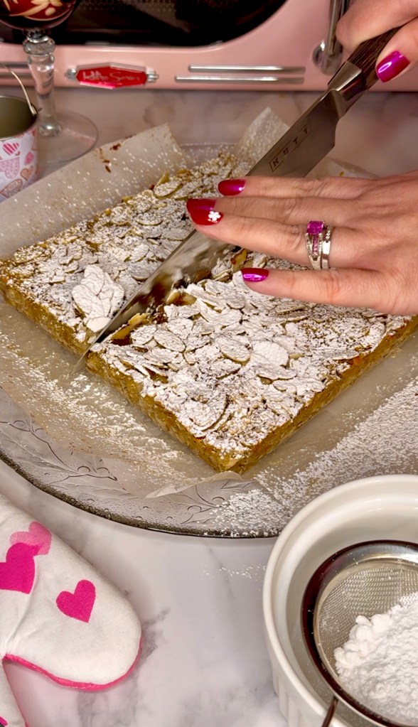 Make sure you use parchment paper for this almond croissant baked oatmeal recipe so you can easily pull it out of the pan when it’s cool. I sprayed both the pan and parchment with Pamela and I don’t know that that was necessary. Then you’re going to sift some powdered sugar on top if you want, you don’t have to if you want less and or no refined sugar but I really like the looks of it. I use a sieve to achieve the results.