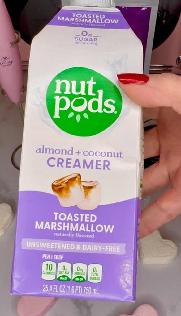 To make the pink cold foam on top of our pink Valentine’s Day latte, I used nut pods toasted marshmallow because I love the flavor but you can use the French vanilla or sweet nut pods. You could even just use dairy free heavy cream too. The foam won’t foam if it’s not a cream type replacement. Like, you can’t make the foam with just almond milk.