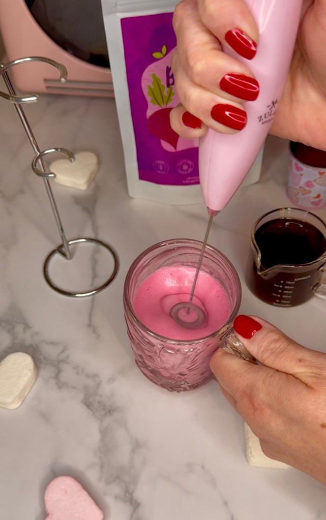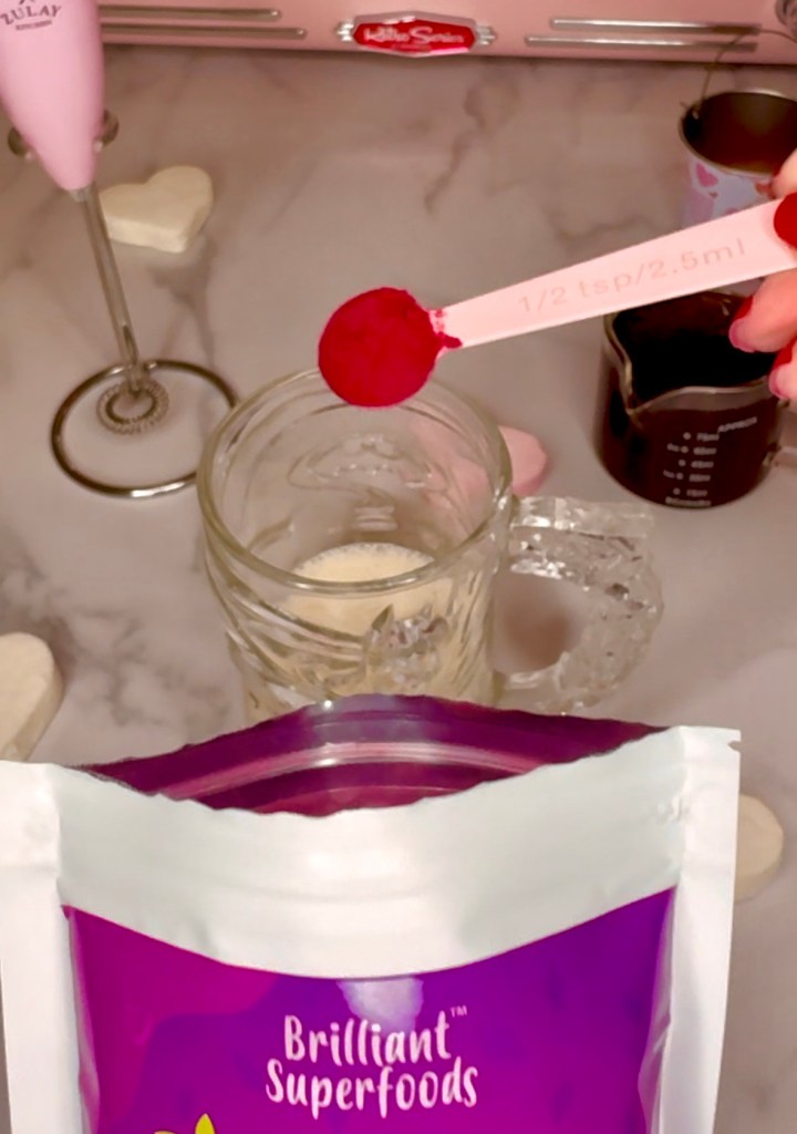 I used 1/2 tsp of beet root juice powder from Ellie’s Best, because theirs is the best! It also adds extra sweetness and antioxidants to this pink dairy free Valentine’s Day latte. If you want a lighter pink, use less, a more vibrant pink, use more. I used these pink measuring spoons from Amazon for an extra pink vibe. All the rest of the products in this blog post will also be from Amazon.