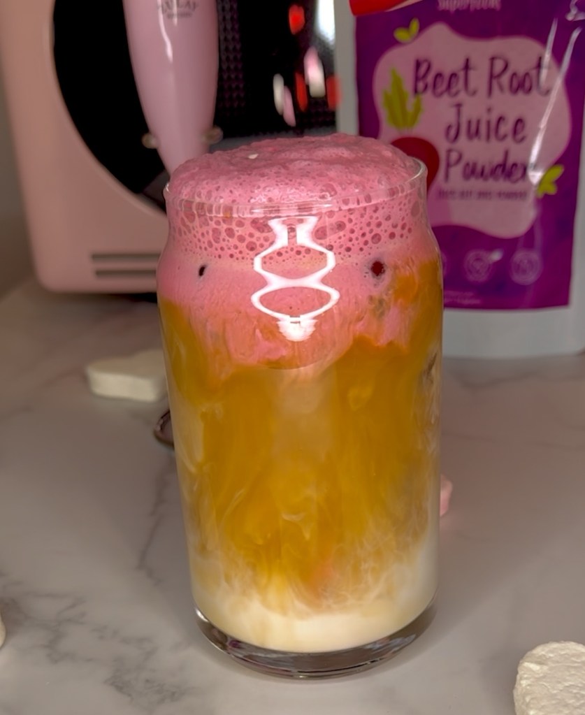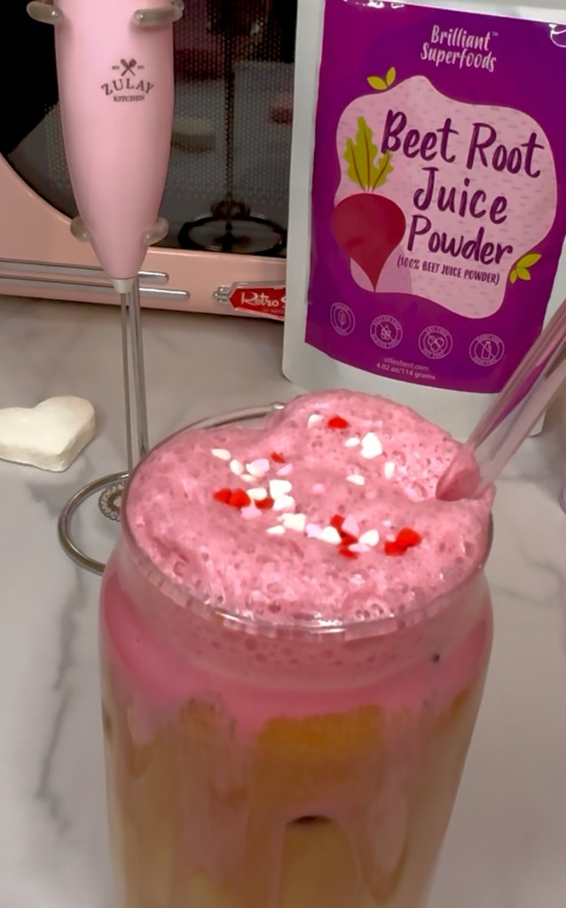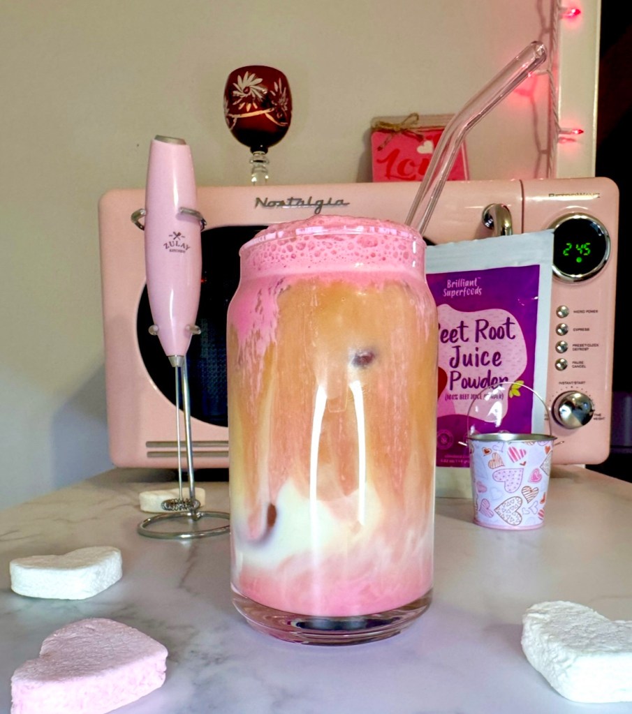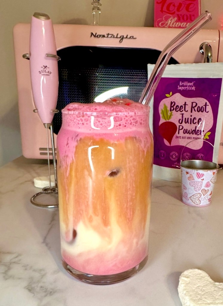 Valentine’s Day is upon us, so let’s make a healthy pink vegan dairy free latte at home!