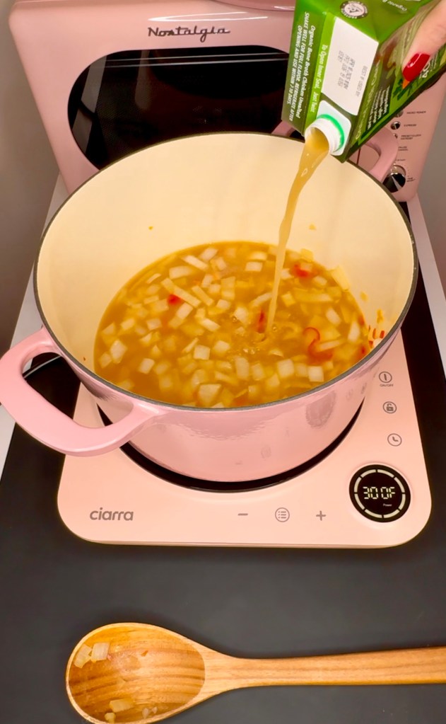 - Add broth, pumpkin purée, seasonings and pasta, stir