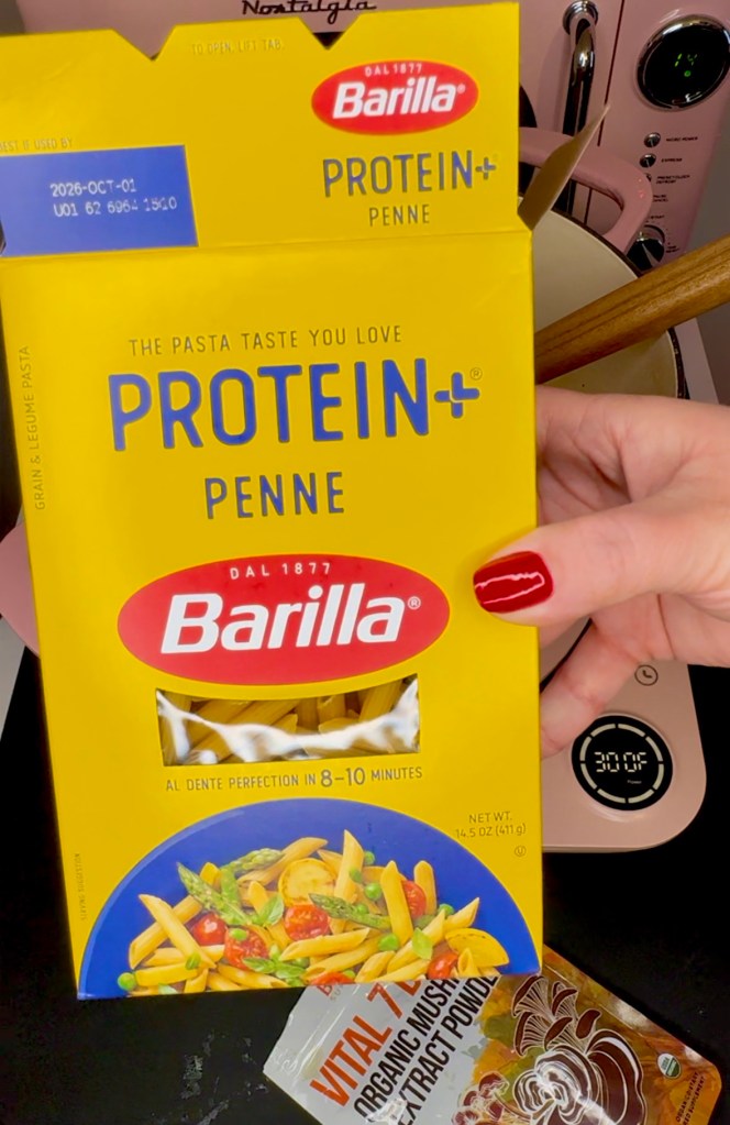 I used protein pasta for my one pot pasta to help with my protein intake. I love Barilla’s line of protein pasta. It doesn’t taste different than their regular pasta, imho. I also enjoy Goodles brand protein pasta too.