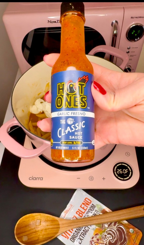 This part is optional but I find it add a lot of subtle warmth and extra flavor. I used to use sriracha for this recipe but I switched to Hot Ones’ Garlic Fresno for multiple reasons. A) I think it tastes better, B) it has a third of the amount of sodium and C) sriracha’s look and flavor changed once they cut ties with their pepper supplier. I don’t know if you had noticed but sriracha is harder to find now and it’s more brown than red because they’re having to use some not as ripe green peppers instead of the ripened red ones.