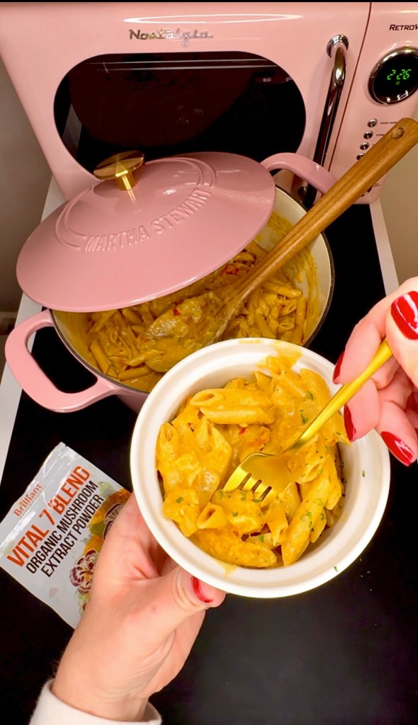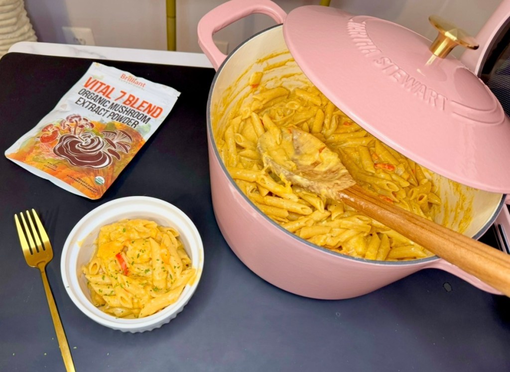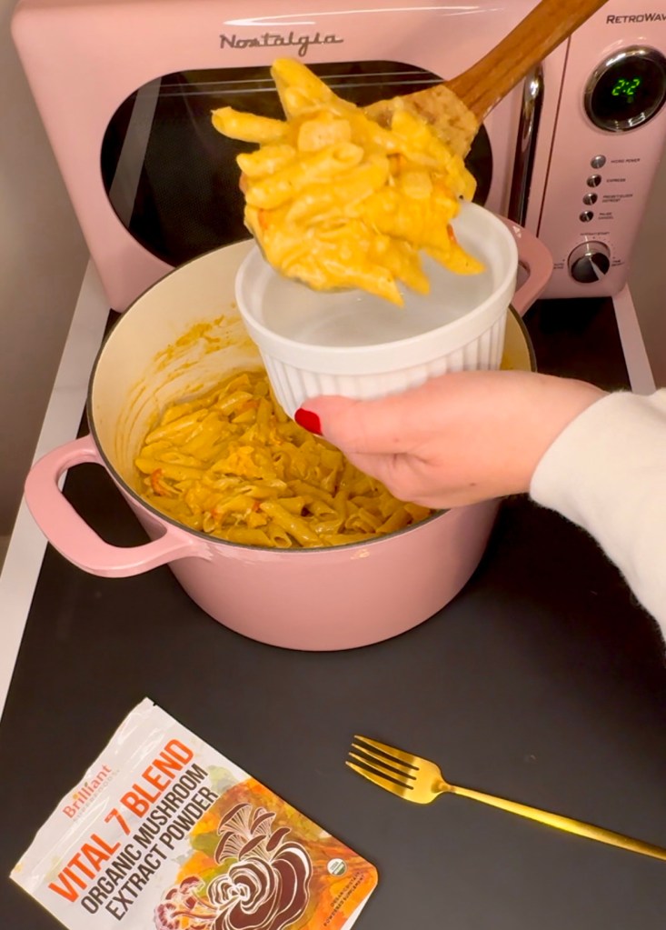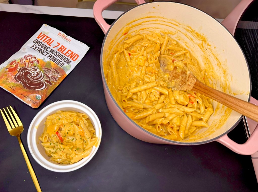 You can season this one pot pasta however you want, but I love starting with this mushroom powder by Ellie’s Best because it gives such a warm deep umami flavor with extra nutrients.