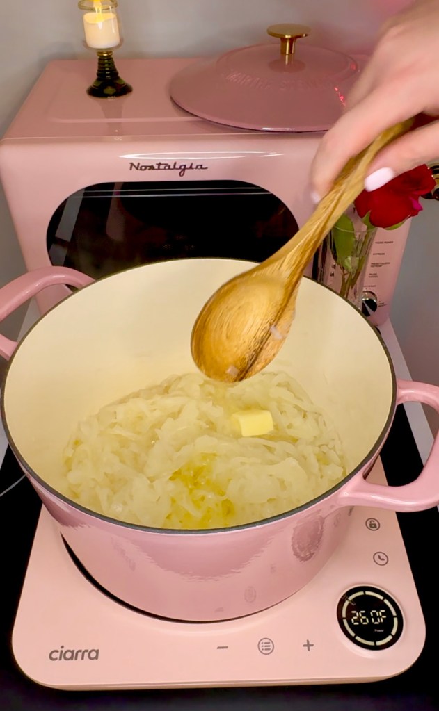 - Add onions and water to a large Dutch oven and cook down until water is just about gone and onions have softened