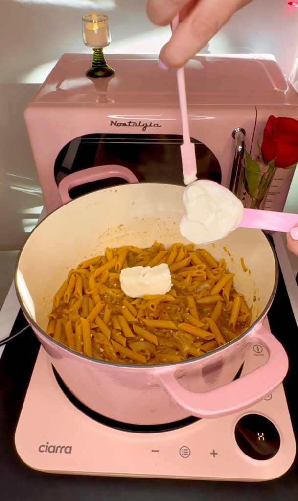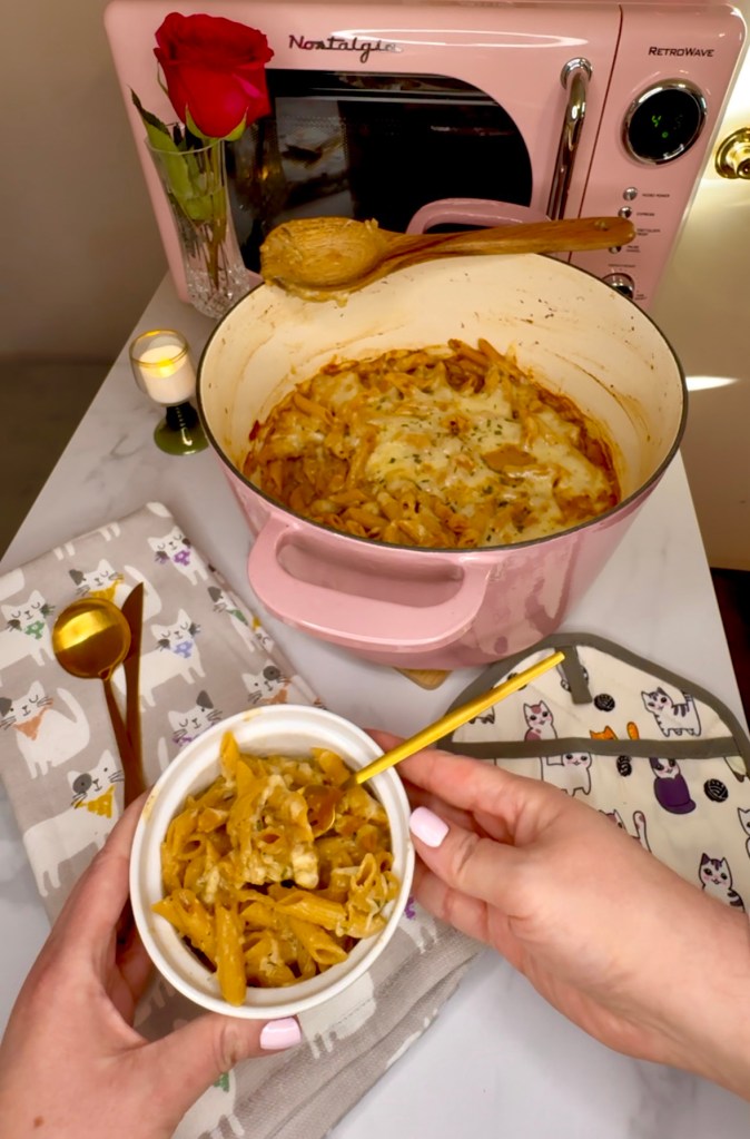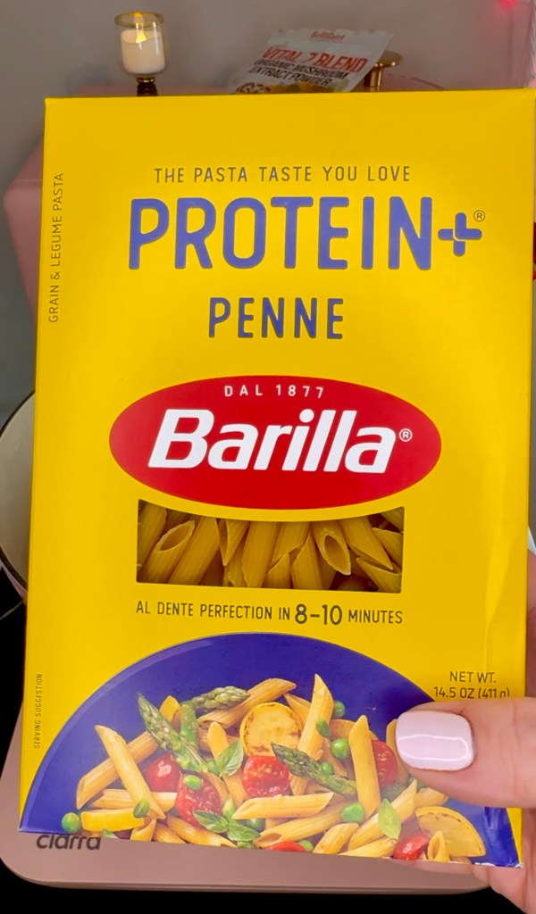Regular penne pasta also works but I love this protein pasta because why not add extra protein while we’re at it, ya know? Barilla and Goodles have the best protein pasta in my opinion. Goodles may even be a little better but it’s more expensive for less pasta, which is why I chose the Barilla pasta.