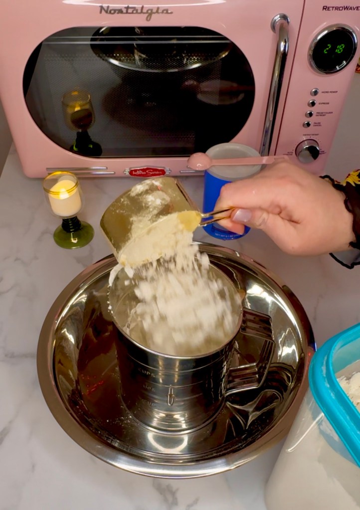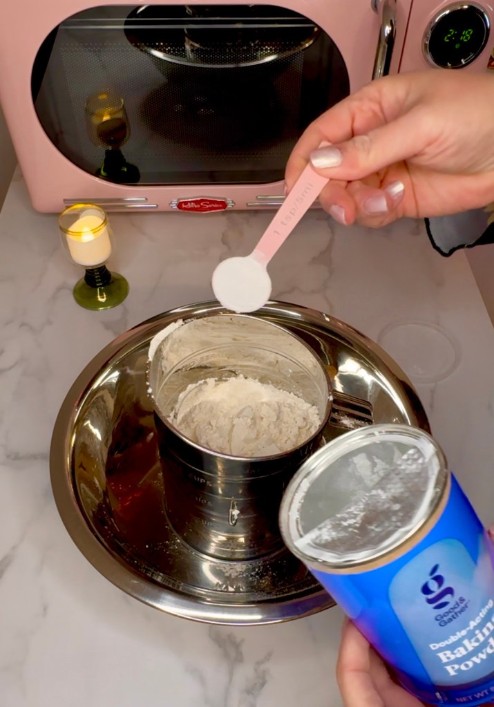 I’m going to share some of my favorite Amazon products that I use every day for all my baking but also my every day dinners and meals. These metal bowls come in a set which is great for preparing your ingredients before you begin cooking. They’re also super lightweight which is nice. Start by sifting 1 1/2 cups all purpose flour and 2 tsp baking powder together.