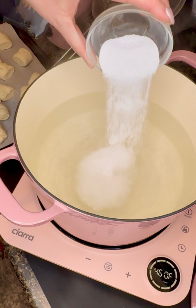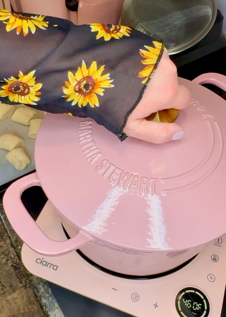 Boil some water. I really want to share this beautiful pink cast iron Dutch oven from Martha. She works on my new favorite induction burner because it uses magnets for heat, which means it heats up the pot but the burner. The burner still gets warm from residual heat from the pot but it’s a lot safer to use. I love it so much for our little studio size area that doesn’t have a stove or oven.
