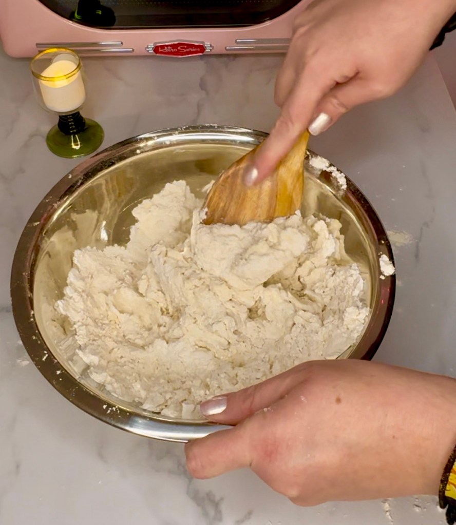 Give it a good mix and then turn it out and finish combining all the ingredients and knead together for a minute. Then I split it in two and roll each section into a roll.