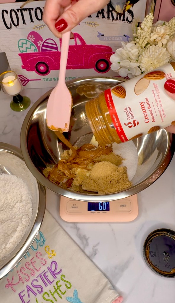 - Mix together the butter, almond butter, granulated sugar and brown sugar together