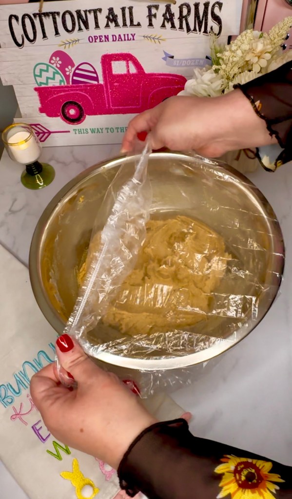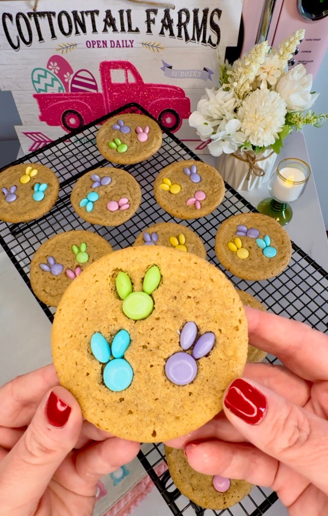 And as soon as they come out, it’s time to add your M&M Easter candy in the shape of Easter bunnies! Kind of like peanut butter blossom vibes but with M&Ms.