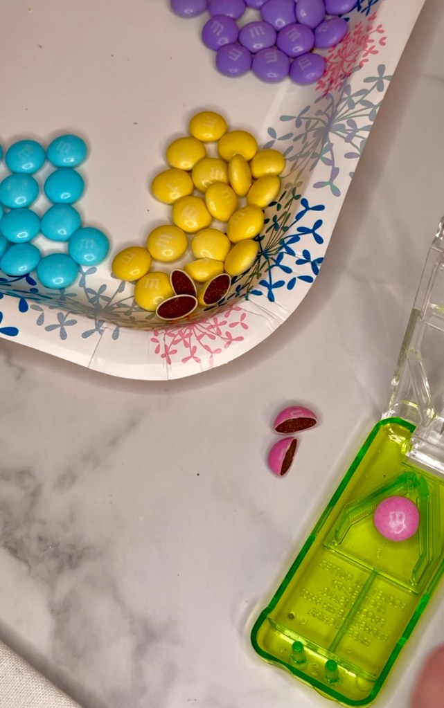 While your gluten free cookie dough is chilling, you can start by separating the Easter M&M colors and start cutting some of them. The cut M&Ms candy is used for the Easter bunny ears. I use a pill cutter to achieve this result. I washed it before and after.