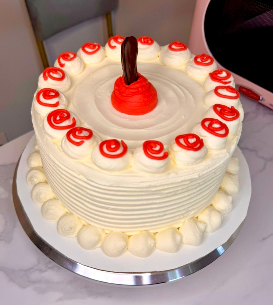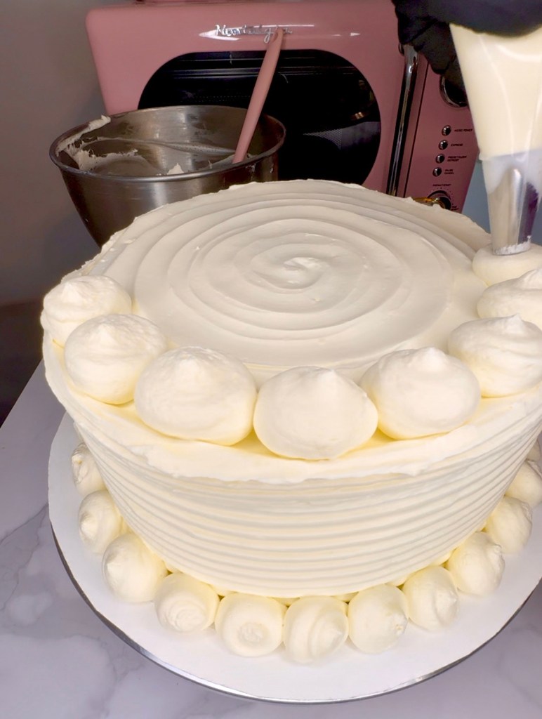 Then I used my offset spatula so make the swirl on top by spinning the cake turntable while slightly pushing it into the whipped frosting.