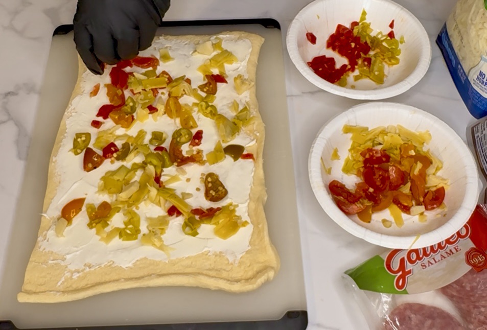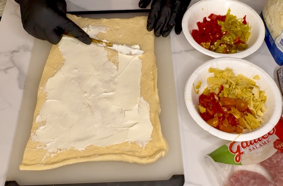 I used the ‘dough sheet’ crescent roll tube but you can certainly use the regular crescent roll tubes and just pinch the triangle seams together. Spread some softened cream cheese on your crescent roll sheet.