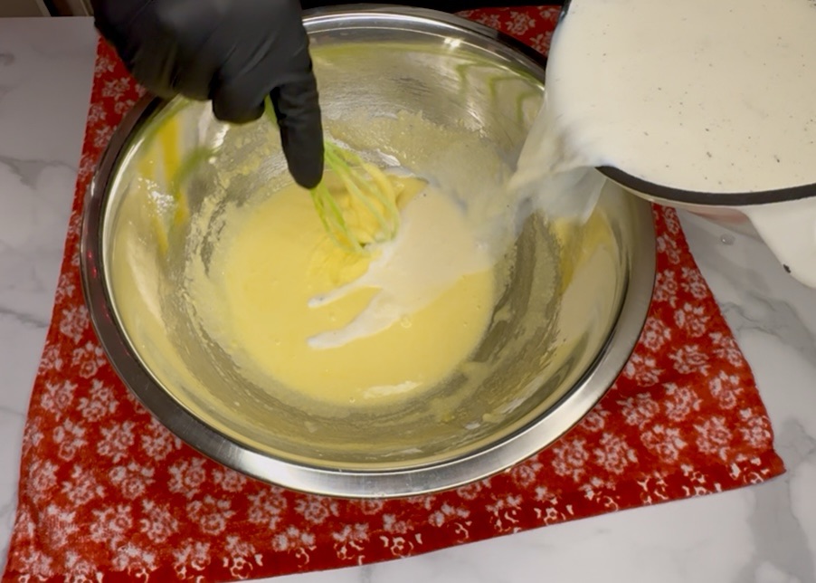2. Whisk together all four eggs and then slowly add them, about an egg at a time to your cooled flour ball mixture. You may not need all 4 eggs, so take it easy at the end and look for a pipable texture that holds a v shape when held up with a spatula