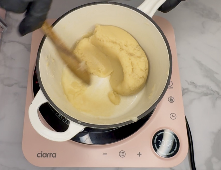 - Bring water, milk, butter, salt and sugar to a low boil, turn down the heat and add the flour, mixing continuously and then keep stirring until everything is incorporated and it starts forming a ball in the pan and leaving a thin residue on the bottom, let cool