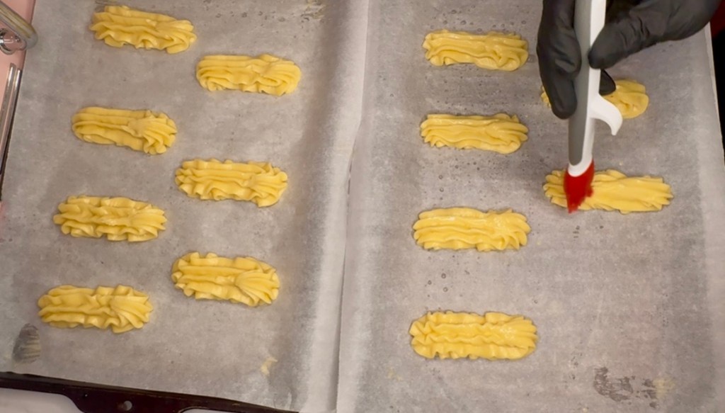 3. Pipe eclair shapes onto a parchment lined baking sheet and bake in a preheated 400°F oven for 20 mins, then turn down the oven to 350°F for another 10-12 minutes
