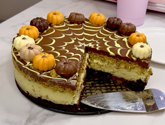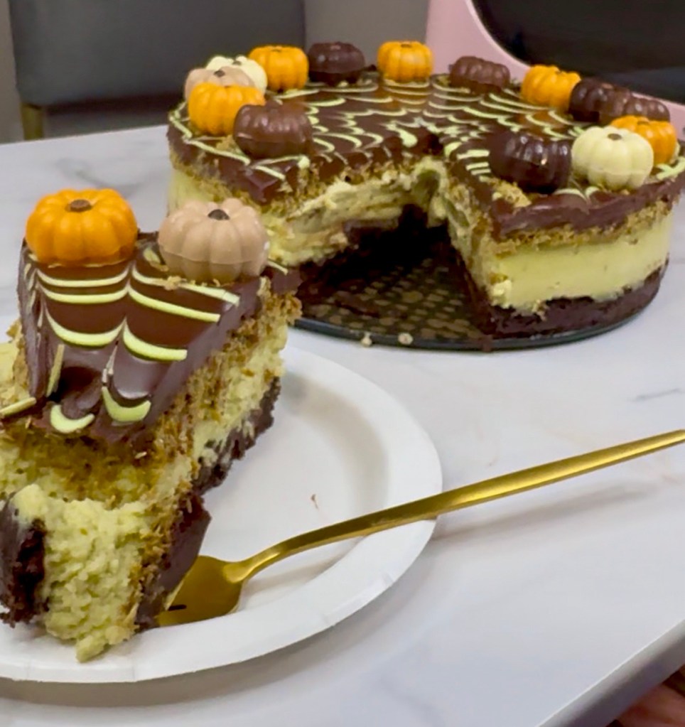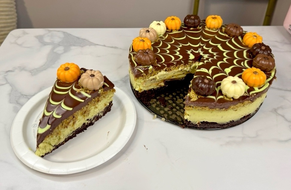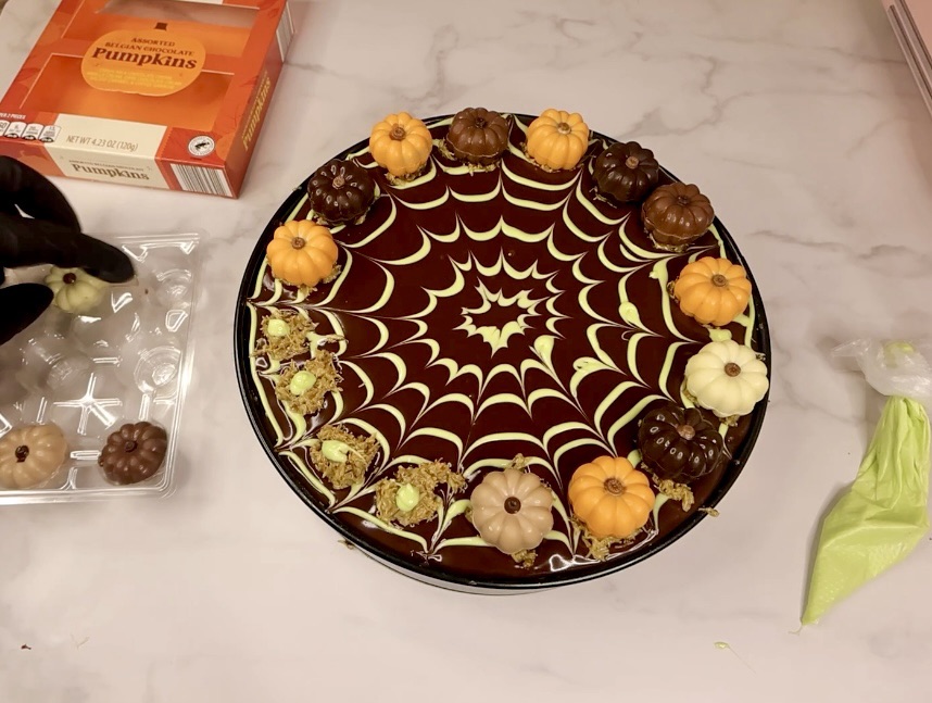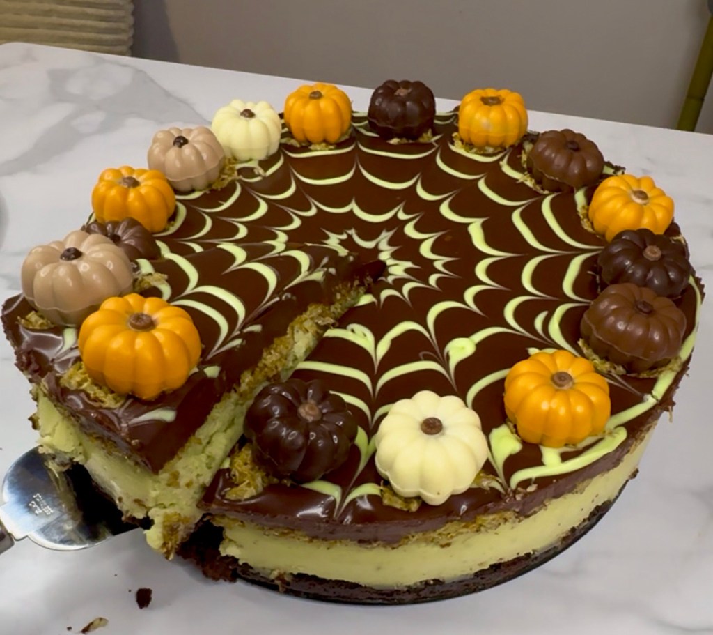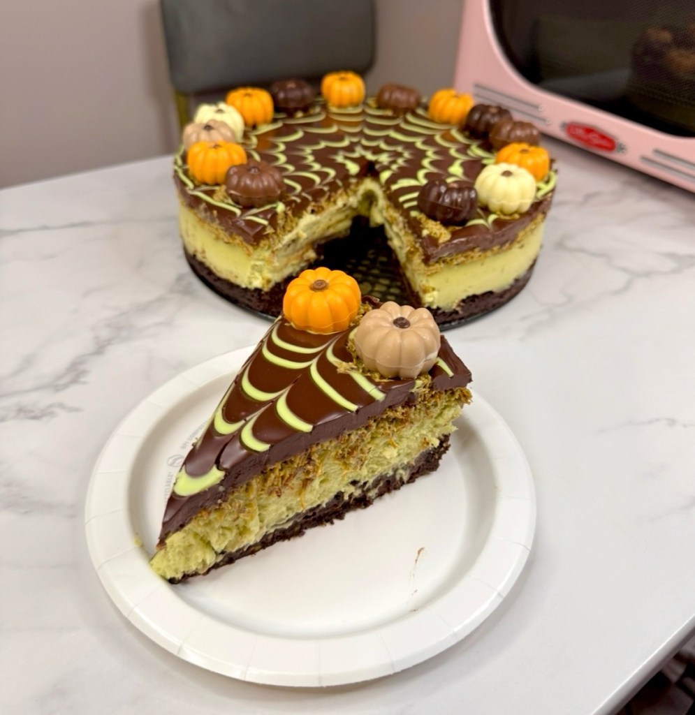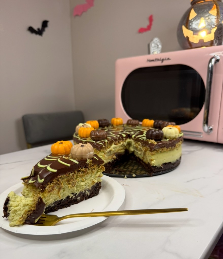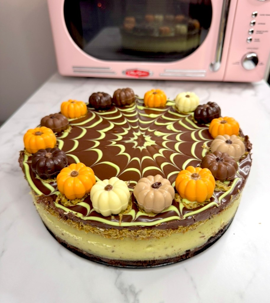 I made this Dubai chocolate brownie cheesecake with a little fall decorating just because it’s October, but even without the spiderweb and pumpkin chocolate decor, it tastes rich and decadent!