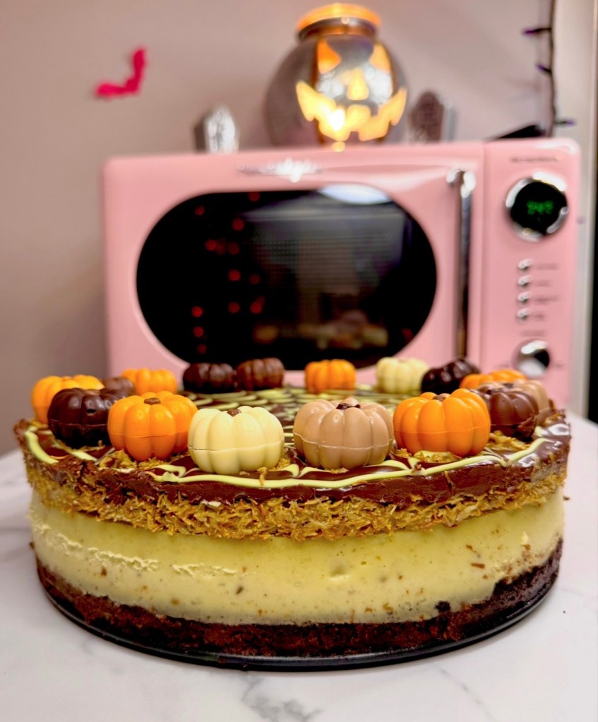 I added a little Kataifi to each section because I thought it looked like grass for a pumpkin patch. And then I used the rest over chocolate as ‘glue’ to adhere the pumpkin chocolates I got from Aldi to the Kataifi and then back in the fridge for everything to set completely.