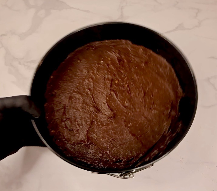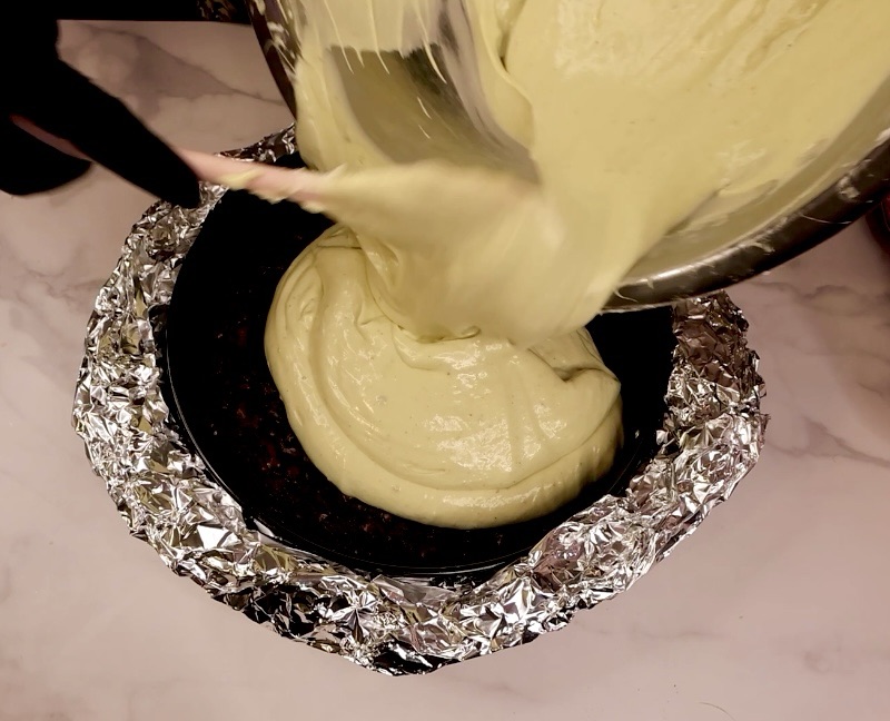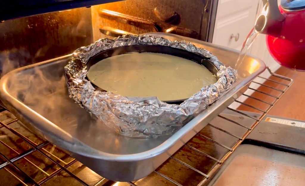 - Cover the bottom and sides of your springform pan that has your baked brownie with lots of aluminum foil so that no water can get in. Or if you don’t feel confident in your aluminum foil skills, just put your water bath on the shelf below your cheesecake, but you do need a large pan full of hot water to create steam in your oven.