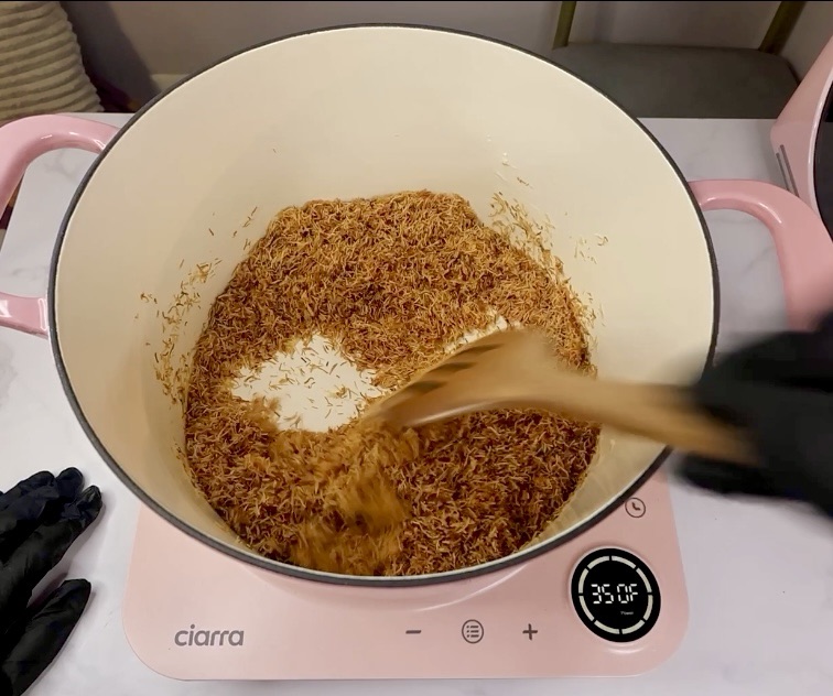 Then it’s time for the Kataifi pistachio mixture. Add a couple tablespoons unsalted butter to a large pot. I use such a big pot because I feel like the Kataifi likes to dance when toasting and you don’t wanna lose your Kataifi. I do 200g of shredded Kataifi.