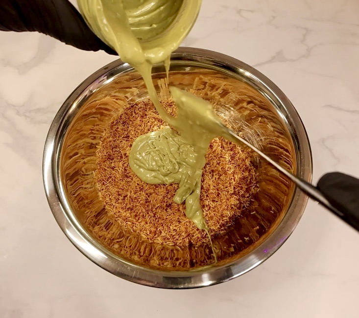 Then add about 3/4 cup pistachio butter and a dash of tahini. I add some extra cashew butter too because I don’t want to buy more than 2 pistachio butters and I need a little more wetness to the Kataifi.
