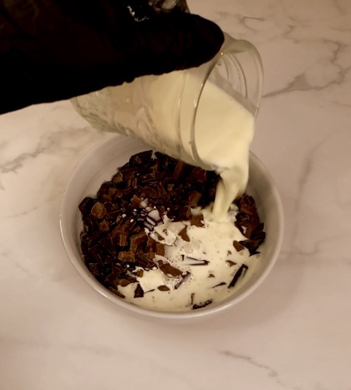- Heat heavy cream in microwave or on the stove top until it reaches 176-185°F and then pour it over the chopped chocolates in a heat safe bowl.