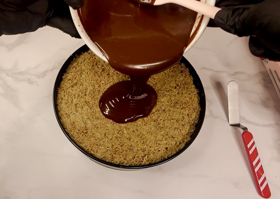 Gently spread the mixture onto the top of the pistachio cheesecake after it’s firmed in the fridge a bit and then put back in the fridge to start on the ganache. (I saved a little bit for the top decoration)