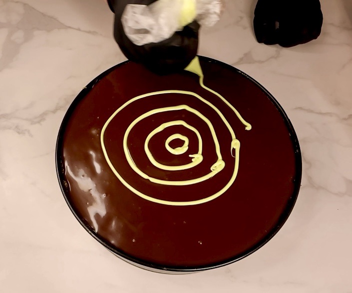 While the ganache is still wet, melt some white chocolate (I added a little green oil based food coloring but you don’t have to do that) and add it to a piping bag. I made rings but it would be easier to just do a swirl starting in the center and working your way out, I don’t know why I didn’t just do that, to be honest.