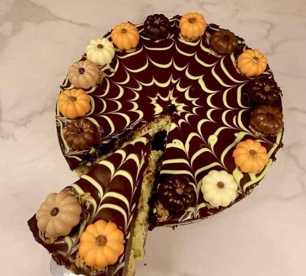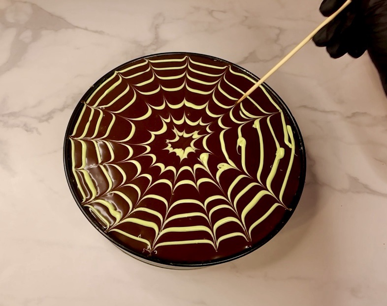 Then take a skewer and gently swipe from the middle outwards to make the cool spiderweb design. Make sure to do that right away before the chocolate sets. Wipe off the skewer before each swipe to keep it a clean design.